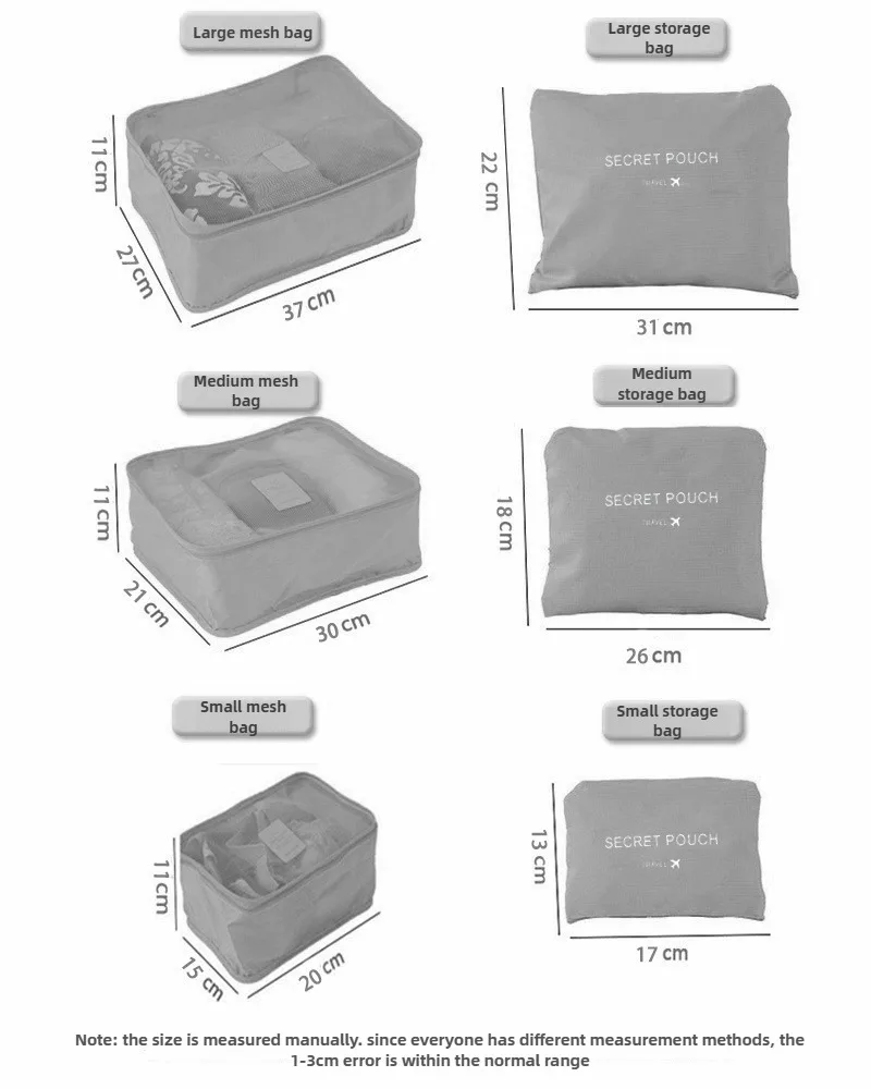 The set includes three mesh-top cubes for bulkier items (like shirts, pants, and sweaters) and three laundry/zipper pouches for smaller essentials (like socks, toiletries, or charging cables). Made from lightweight, durable nylon, they keep your items secure without adding extra weight to your bag.